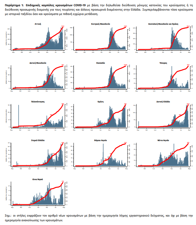 Γεωγραφική διασπορά: Ο χάρτης αποτυπώνει τη γεωγραφική κατανομή των συνολικών κρουσμάτων COVID-19 (από την αρχή της επιδημίας) ανά Περιφερειακή Ενότητα της χώρας, με βάση την δηλωθείσα διεύθυνση μόνιμης κατοικίας του ασθενούς, ή τη διεύθυνση προσωρινής διαμονής για τους τουρίστες και άλλους προσωρινά διαμένοντες στην Ελλάδα. Συμπεριλαμβάνονται τόσο κρούσματα με ιστορικό ταξιδίου (“εισαγόμενα”) όσο και κρούσματα με πιθανή εγχώρια μετάδοση.