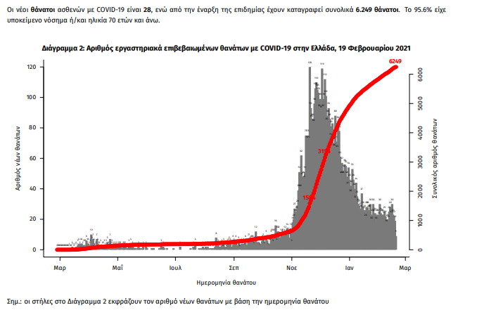 Τα στοιχεία που παρουσιάζονται αφορούν περιστατικά από την επιδημιολογική επιτήρηση της νόσου από το νέο κορωνοϊό (COVID19), με βάση τα δεδομένα που έχουν δηλωθεί στον ΕΟΔΥ και καταγραφεί μέχρι τις 19 Φεβρουαρίου 2021 (ώρα 15:00). Τα νέα εργαστηριακά επιβεβαιωμένα κρούσματα της νόσου που καταγράφηκαν τις τελευταίες 24 ώρες είναι 1.460, εκ των οποίων 2 εντοπίστηκαν κατόπιν ελέγχων στις πύλες εισόδου της χώρας. Ο συνολικός αριθμός των κρουσμάτων ανέρχεται σε 177.494 (ημερήσια μεταβολή +0.8%), εκ των οποίων 51.8% άνδρες. 1 Με βάση τα επιβεβαιωμένα κρούσματα των τελευταίων 7 ημερών, 49 θεωρούνται σχετιζόμενα με ταξίδι από το εξωτερικό και 1.615 είναι σχετιζόμενα με ήδη γνωστό κρούσμα. Ημερήσια εξέλιξη της πανδημίας: Η ημερήσια κατανομή των επιβεβαιωμένων κρουσμάτων είναι η ακόλουθη (η γραμμή παριστάνει την συνολική, αθροιστική κατανομή των κρουσμάτων).