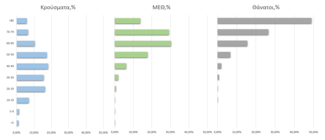 Ακολούθως παρουσιάζεται η ηλικιακή κατανομή των (α) συνολικών κρουσμάτων, (β) των περιστατικών που κατέληξαν σε θάνατο και (γ) των ασθενών που νοσηλεύονται διασωληνωμένοι: