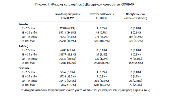 Ο αριθμός των ασθενών που νοσηλεύονται διασωληνωμένοι είναι 325 (67.4% άνδρες). Η διάμεση ηλικία τους είναι 70 έτη. To 88.6% έχει υποκείμενο νόσημα ή/και ηλικία 70 ετών και άνω. Από την αρχή της πανδημίας έχουν εξέλθει από τις ΜΕΘ 1.267 ασθενείς. Οι νέες εισαγωγές2 ασθενών Covid-19 στα νοσοκομεία της επικράτειας είναι 277 (ημερήσια μεταβολή +53.04%). Ο μέσος όρος εισαγωγών του επταημέρου είναι 223 ασθενείς. Hλικιακή κατανομή:Η διάμεση ηλικία των κρουσμάτων είναι 44 έτη (εύρος 0.2 έως 105 έτη), ενώ η διάμεση ηλικία των θανόντων είναι 79 έτη (εύρος 15 έως 103 έτη).