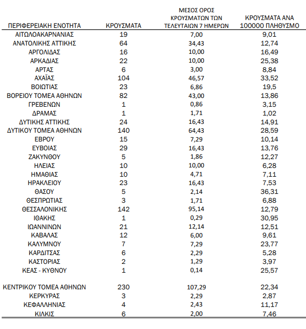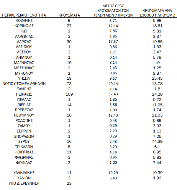 Κατανομή ανακοινωθέντων εγχώριων κρουσμάτων: Από το σύνολο των 1.460 νέων κρουσμάτων του νέου ιού στη χώρα 5 είναι εισαγόμενα εκ των οποίων 2 εντοπίστηκαν κατόπιν ελέγχων στις πύλες εισόδου της χώρας. Η κατανομή των 1.455 νέων εγχώριων κρουσμάτων ανά Περιφερειακή Ενότητα παρουσιάζεται στον κατωτέρω πίνακα.3