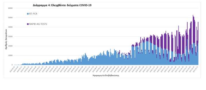 Δείγματα που έχουν ελεγχθεί: Από την 1η Ιανουαρίου 2020 μέχρι σήμερα, στα εργαστήρια που διενεργούν ελέγχους για τον νέο κορωνοϊό (SARS-CoV-2) και που δηλώνουν συστηματικά το σύνολο των δειγμάτων που ελέγχουν, έχουν συνολικά ελεγχθεί 3.467.996 κλινικά δείγματα ενώ από Μονάδες Υγείας και Κλιμάκια του ΕΟΔΥ που διενεργούν ελέγχους Rapid Ag έχουν ελεγχθεί 1.408.073 δείγματα. O μέσος όρος του επταημέρου είναι 32.523 δειγματοληπτικοί έλεγχοι.