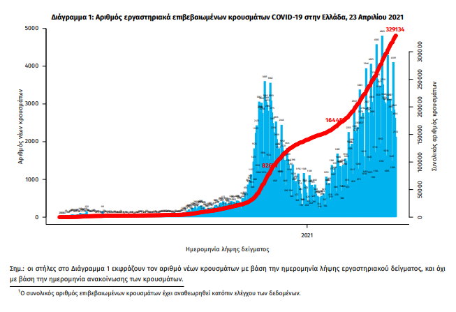 Τα στοιχεία που παρουσιάζονται αφορούν περιστατικά από την επιδημιολογική επιτήρηση της νόσου από το νέο κορωνοϊό (COVID19), με βάση τα δεδομένα που έχουν δηλωθεί στον ΕΟΔΥ και καταγραφεί μέχρι τις 23 Απριλίου 2021 (ώρα 15:00). Τα νέα εργαστηριακά επιβεβαιωμένα κρούσματα της νόσου που καταγράφηκαν τις τελευταίες 24 ώρες είναι 2.754, εκ των οποίων 12 εντοπίστηκαν κατόπιν ελέγχων στις πύλες εισόδου της χώρας. Ο συνολικός αριθμός των κρουσμάτων ανέρχεται σε 329.134 (ημερήσια μεταβολή +0.8%), εκ των οποίων 51.3% άνδρες. 1 Με βάση τα επιβεβαιωμένα κρούσματα των τελευταίων 7 ημερών, 65 θεωρούνται σχετιζόμενα με ταξίδι από το εξωτερικό και 3.094 είναι σχετιζόμενα με ήδη γνωστό κρούσμα. Ημερήσια εξέλιξη της πανδημίας: Η ημερήσια κατανομή των επιβεβαιωμένων κρουσμάτων είναι η ακόλουθη (η γραμμή παριστάνει την συνολική, αθροιστική κατανομή των κρουσμάτων).