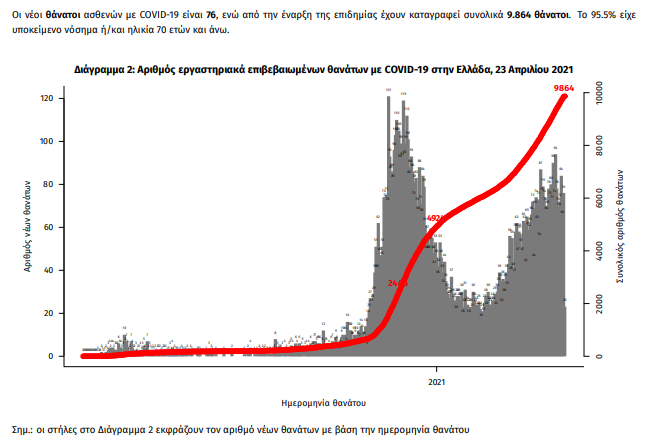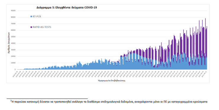 Δείγματα που έχουν ελεγχθεί: Από την 1η Ιανουαρίου 2020 μέχρι σήμερα, στα εργαστήρια που διενεργούν ελέγχους για τον νέο κορωνοϊό (SARS-CoV-2) και που δηλώνουν συστηματικά το σύνολο των δειγμάτων που ελέγχουν, έχουν συνολικά ελεγχθεί 4.551.139 κλινικά δείγματα ενώ από Μονάδες Υγείας και Κλιμάκια του ΕΟΔΥ που διενεργούν ελέγχους Rapid Ag έχουν ελεγχθεί 3.207.678 δείγματα. O μέσος όρος του επταημέρου είναι 54.194 δειγματοληπτικοί έλεγχοι ημερησίως. Mαζικές Δειγματοληψίες ΕΟΔΥ: Στις 22 Απριλίου 2021, πραγματοποιήθηκαν 125 δράσεις δειγματοληπτικών ελέγχων από τις Κινητές Ομάδες Υγείας (ΚΟΜΥ) του ΕΟΔΥ, στις οποίες διενεργήθηκαν 19.793 έλεγχοι Rapid Ag και ανευρέθηκαν 267 θετικά (1,35%).