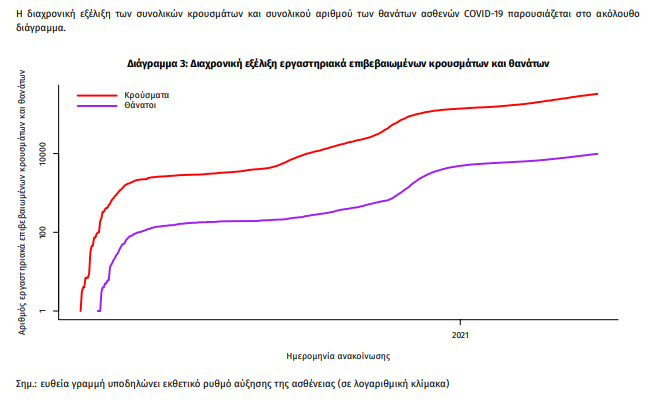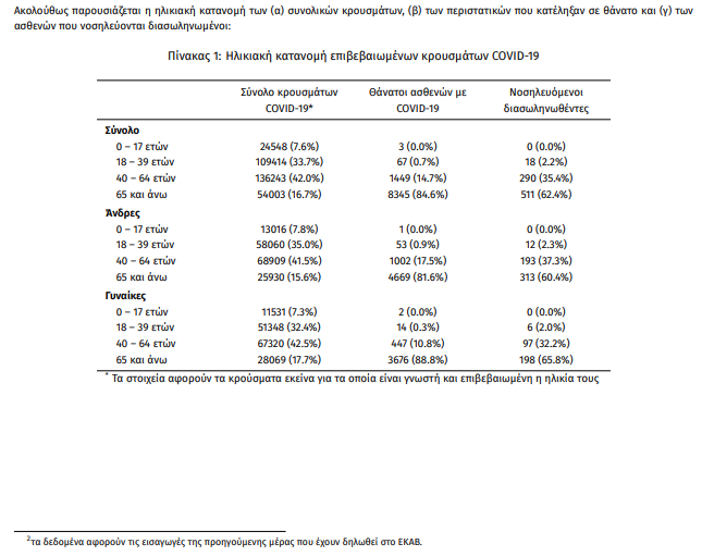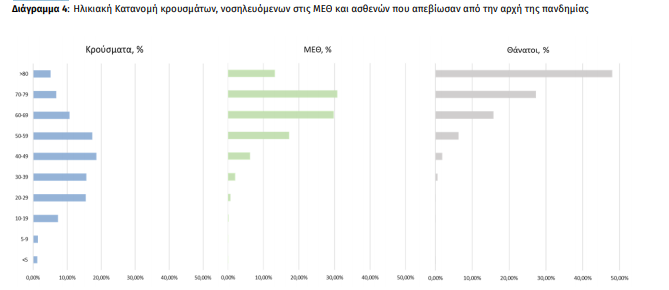 Ο αριθμός των ασθενών που νοσηλεύονται διασωληνωμένοι είναι 819 (63.2% άνδρες). Η διάμεση ηλικία τους είναι 68 έτη. To 84.5% έχει υποκείμενο νόσημα ή/και ηλικία 70 ετών και άνω. Από την αρχή της πανδημίας έχουν εξέλθει από τις ΜΕΘ 2.003 ασθενείς. Οι εισαγωγές2 νέων ασθενών Covid-19 στα νοσοκομεία της επικράτειας είναι 456 (ημερήσια μεταβολή -2.56%). Ο μέσος όρος εισαγωγών του επταημέρου είναι 479 ασθενείς.Η διάμεση ηλικία των κρουσμάτων είναι 44 έτη (εύρος 0.2 έως 106 έτη), ενώ η διάμεση ηλικία των θανόντων είναι 79 έτη (εύρος 0.2 έως 106 έτη).