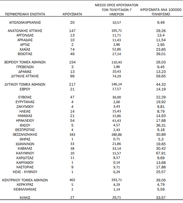 Κατανομή ανακοινωθέντων εγχώριων κρουσμάτων: Από το σύνολο των 2.754 νέων κρουσμάτων του νέου ιού στη χώρα 12 είναι εισαγόμενα εκ των οποίων 12 εντοπίστηκαν κατόπιν ελέγχων στις πύλες εισόδου της χώρας. Η κατανομή των 2.742 νέων εγχώριων κρουσμάτων ανά Περιφερειακή Ενότητα παρουσιάζεται στον κατωτέρω πίνακα.