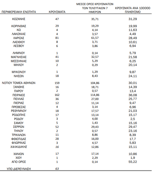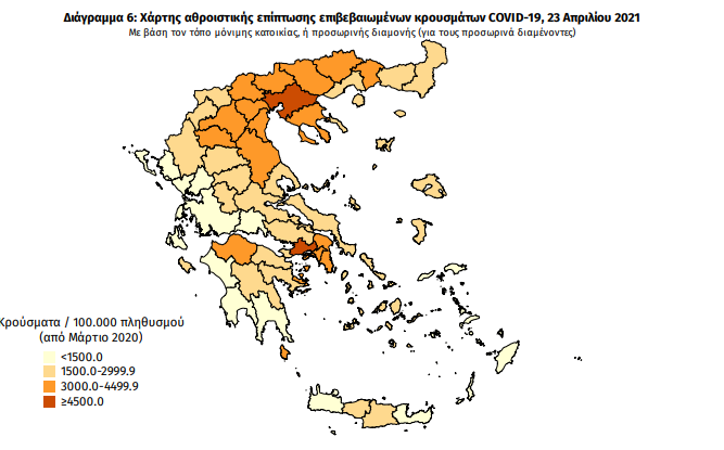 Γεωγραφική διασπορά: Ο χάρτης αποτυπώνει τη γεωγραφική κατανομή των συνολικών κρουσμάτων COVID-19 (από την αρχή της επιδημίας) ανά Περιφερειακή Ενότητα της χώρας, με βάση την δηλωθείσα διεύθυνση μόνιμης κατοικίας του ασθενούς, ή τη διεύθυνση προσωρινής διαμονής για τους τουρίστες και άλλους προσωρινά διαμένοντες στην Ελλάδα. Συμπεριλαμβάνονται τόσο κρούσματα με ιστορικό ταξιδίου (“εισαγόμενα”) όσο και κρούσματα με πιθανή εγχώρια μετάδοση.