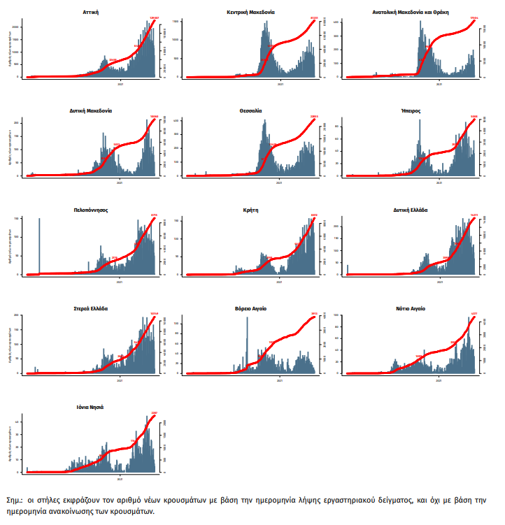 Παράρτημα 1: Επιδημικές καμπύλες κρουσμάτων COVID-19 με βάση την δηλωθείσα διεύθυνση μόνιμης κατοικίας του κρούσματος ή τη διεύθυνση προσωρινής διαμονής για τους τουρίστες και άλλους προσωρινά διαμένοντες στην Ελλάδα. Συμπεριλαμβάνονται τόσο κρούσματα με ιστορικό ταξιδίου όσο και κρούσματα με πιθανή εγχώρια μετάδοση.