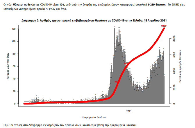 Τα στοιχεία που παρουσιάζονται αφορούν περιστατικά από την επιδημιολογική επιτήρηση της νόσου από το νέο κορωνοϊό (COVID19), με βάση τα δεδομένα που έχουν δηλωθεί στον ΕΟΔΥ και καταγραφεί μέχρι τις 15 Απριλίου 2021 (ώρα 15:00). Τα νέα εργαστηριακά επιβεβαιωμένα κρούσματα της νόσου που καταγράφηκαν τις τελευταίες 24 ώρες είναι 3.833, εκ των οποίων 16 εντοπίστηκαν κατόπιν ελέγχων στις πύλες εισόδου της χώρας. Ο συνολικός αριθμός των κρουσμάτων ανέρχεται σε 308.006 (ημερήσια μεταβολή +1.3%), εκ των οποίων 51.3% άνδρες. 1 Με βάση τα επιβεβαιωμένα κρούσματα των τελευταίων 7 ημερών, 60 θεωρούνται σχετιζόμενα με ταξίδι από το εξωτερικό και 2.636 είναι σχετιζόμενα με ήδη γνωστό κρούσμα. Ημερήσια εξέλιξη της πανδημίας: Η ημερήσια κατανομή των επιβεβαιωμένων κρουσμάτων είναι η ακόλουθη (η γραμμή παριστάνει την συνολική, αθροιστική κατανομή των κρουσμάτων).