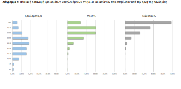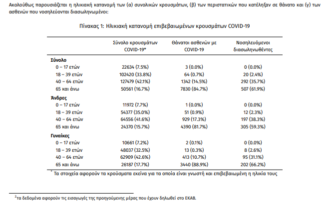 Ο αριθμός των ασθενών που νοσηλεύονται διασωληνωμένοι είναι 819 (62.9% άνδρες). Η διάμεση ηλικία τους είναι 68 έτη. To 84.9% έχει υποκείμενο νόσημα ή/και ηλικία 70 ετών και άνω. Από την αρχή της πανδημίας έχουν εξέλθει από τις ΜΕΘ 1.925 ασθενείς. Οι εισαγωγές2 νέων ασθενών Covid-19 στα νοσοκομεία της επικράτειας είναι 526 (ημερήσια μεταβολή -6.41%). Ο μέσος όρος εισαγωγών του επταημέρου είναι 515 ασθενείς.Η διάμεση ηλικία των κρουσμάτων είναι 44 έτη (εύρος 0.2 έως 106 έτη), ενώ η διάμεση ηλικία των θανόντων είναι 79 έτη (εύρος 0.2 έως 106 έτη).