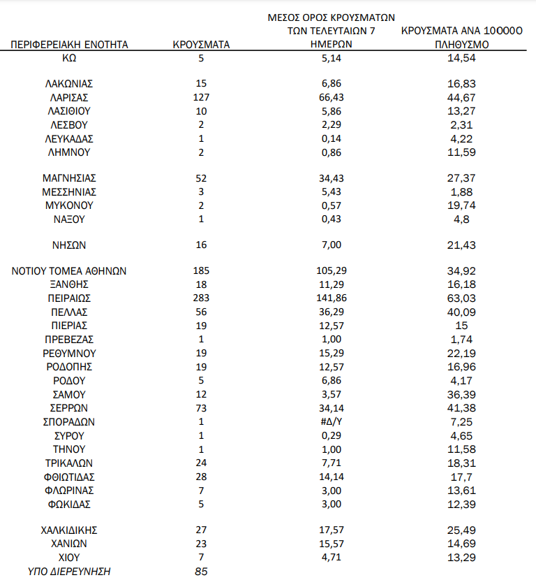 Γεωγραφική διασπορά: Ο χάρτης αποτυπώνει τη γεωγραφική κατανομή των συνολικών κρουσμάτων COVID-19 (από την αρχή της επιδημίας) ανά Περιφερειακή Ενότητα της χώρας, με βάση την δηλωθείσα διεύθυνση μόνιμης κατοικίας του ασθενούς, ή τη διεύθυνση προσωρινής διαμονής για τους τουρίστες και άλλους προσωρινά διαμένοντες στην Ελλάδα. Συμπεριλαμβάνονται τόσο κρούσματα με ιστορικό ταξιδίου (“εισαγόμενα”) όσο και κρούσματα με πιθανή εγχώρια μετάδοση.