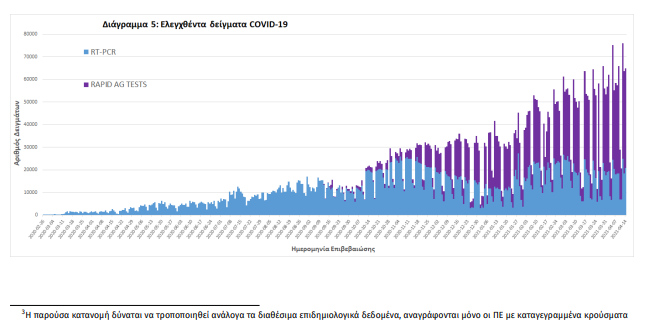 Δείγματα που έχουν ελεγχθεί: Από την 1η Ιανουαρίου 2020 μέχρι σήμερα, στα εργαστήρια που διενεργούν ελέγχους για τον νέο κορωνοϊό (SARS-CoV-2) και που δηλώνουν συστηματικά το σύνολο των δειγμάτων που ελέγχουν, έχουν συνολικά ελεγχθεί 4.420.307 κλινικά δείγματα ενώ από Μονάδες Υγείας και Κλιμάκια του ΕΟΔΥ που διενεργούν ελέγχους Rapid Ag έχουν ελεγχθεί 2.893.942 δείγματα. O μέσος όρος του επταημέρου είναι 53.940 δειγματοληπτικοί έλεγχοι. Mαζικές Δειγματοληψίες ΕΟΔΥ: Στις 14 Απριλίου 2021, πραγματοποιήθηκαν 124 δράσεις δειγματοληπτικών ελέγχων από τις Κινητές Ομάδες Υγείας (ΚΟΜΥ) του ΕΟΔΥ, στις οποίες διενεργήθηκαν 16.800 έλεγχοι Rapid Ag και ανευρέθηκαν 354 θετικά (2,11%).