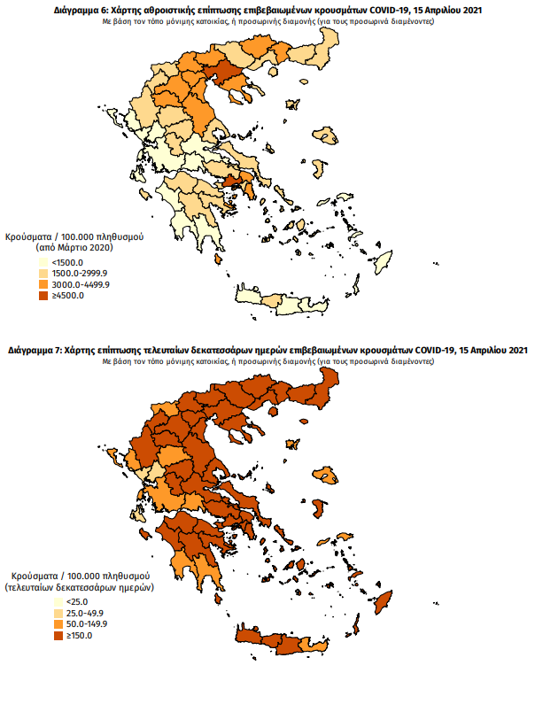 Κατανομή ανακοινωθέντων εγχώριων κρουσμάτων: Από το σύνολο των 3.833 νέων κρουσμάτων του νέου ιού στη χώρα 17 είναι εισαγόμενα εκ των οποίων 16 εντοπίστηκαν κατόπιν ελέγχων στις πύλες εισόδου της χώρας. Η κατανομή των 3.816 νέων εγχώριων κρουσμάτων ανά Περιφερειακή Ενότητα παρουσιάζεται στον κατωτέρω πίνακα.3 Πίνακας 2: Ημερήσιος αριθμός και κρούσματα ανά 100.000 πληθυσμού επιβεβαιωμένων εγχώριων κρουσμάτων COVID-19 ανά περιφερειακή ενότητα στις 15 Απριλίου 2021
