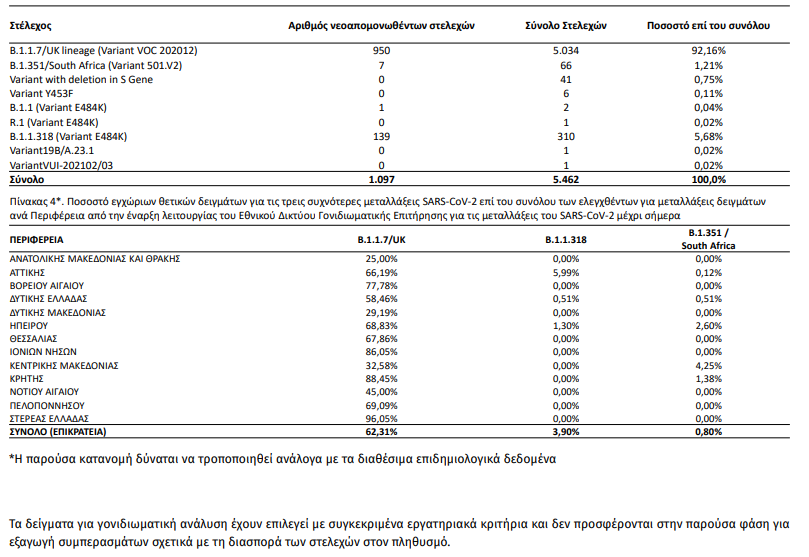 Συνολικά έχουν ελεγχθεί για μεταλλάξεις στην επικράτεια 7.954 δείγματα από εγχώρια κρούσματα από την έναρξη λειτουργίας του Εθνικού Δικτύου Γονιδιωματικής Επιτήρησης μεταλλάξεων SARS-CoV-2 μέχρι σήμερα. Επί του συνόλου των ελεγχθέντων για μεταλλάξεις εγχώριων δειγμάτων, οι τρεις πιο συχνές μεταλλάξεις που έχουν απομονωθεί είναι η Β.1.1.7/UK lineage (Variant VOC_202012), με ποσοστό 62,3%, ακολουθούμενη από τη B.1.1.318 (Variant_E484K) με ποσοστό 3,9% και τη B.1.351/South Africa (Variant 501.V2) με ποσοστό 0,8% (Πίνακας 4).