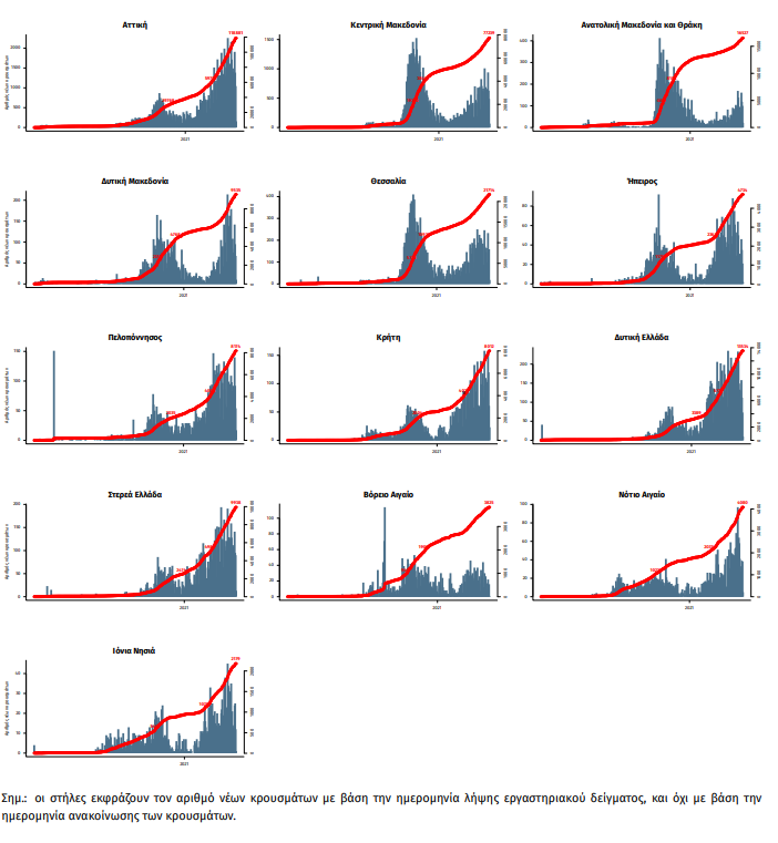 Παράρτημα 1: Επιδημικές καμπύλες κρουσμάτων COVID-19 με βάση την δηλωθείσα διεύθυνση μόνιμης κατοικίας του κρούσματος ή τη διεύθυνση προσωρινής διαμονής για τους τουρίστες και άλλους προσωρινά διαμένοντες στην Ελλάδα. Συμπεριλαμβάνονται τόσο κρούσματα με ιστορικό ταξιδίου όσο και κρούσματα με πιθανή εγχώρια μετάδοση.