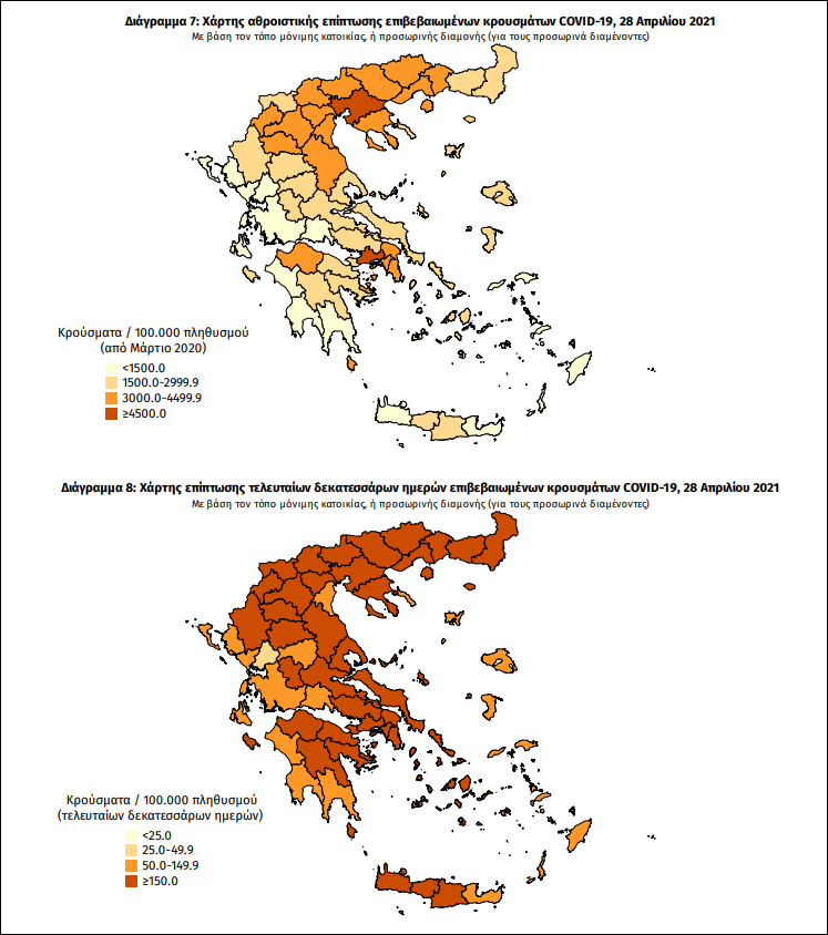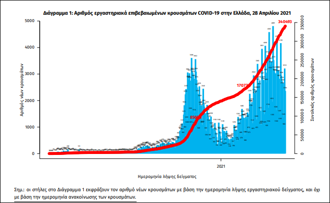 Τα στοιχεία που παρουσιάζονται αφορούν περιστατικά από την επιδημιολογική επιτήρηση της νόσου από το νέο κορωνοϊό (COVID19), με βάση τα δεδομένα που έχουν δηλωθεί στον ΕΟΔΥ και καταγραφεί μέχρι τις 28 Απριλίου 2021 (ώρα 15:00). Τα νέα εργαστηριακά επιβεβαιωμένα κρούσματα της νόσου που καταγράφηκαν τις τελευταίες 24 ώρες είναι 2.781, εκ των οποίων 2 εντοπίστηκαν κατόπιν ελέγχων στις πύλες εισόδου της χώρας. Ο συνολικός αριθμός των κρουσμάτων ανέρχεται σε 340.493 (ημερήσια μεταβολή +0.8%), εκ των οποίων 51.3% άνδρες. Με βάση τα επιβεβαιωμένα κρούσματα των τελευταίων 7 ημερών, 54 θεωρούνται σχετιζόμενα με ταξίδι από το εξωτερικό και 2.455 είναι σχετιζόμενα με ήδη γνωστό κρούσμα. To για την επικράτεια εκτιμάται σε 0.97 (95%Crl: 0.37 – 1.46)