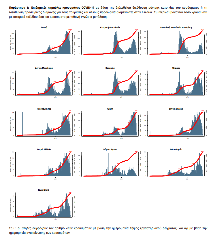 Γεωγραφική διασπορά: Ο χάρτης αποτυπώνει τη γεωγραφική κατανομή των συνολικών κρουσμάτων COVID-19 (από την αρχή της επιδημίας) ανά Περιφερειακή Ενότητα της χώρας, με βάση την δηλωθείσα διεύθυνση μόνιμης κατοικίας του ασθενούς, ή τη διεύθυνση προσωρινής διαμονής για τους τουρίστες και άλλους προσωρινά διαμένοντες στην Ελλάδα. Συμπεριλαμβάνονται τόσο κρούσματα με ιστορικό ταξιδίου (“εισαγόμενα”) όσο και κρούσματα με πιθανή εγχώρια μετάδοση.