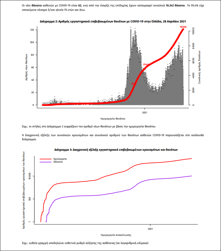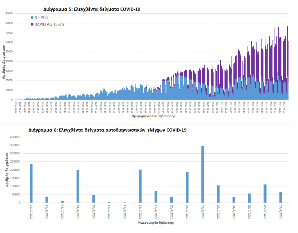 Δείγματα που έχουν ελεγχθεί: Από την 1η Ιανουαρίου 2020 μέχρι σήμερα, στα εργαστήρια που διενεργούν ελέγχους για τον νέο κορωνοϊό (SARS-CoV-2) και που δηλώνουν συστηματικά το σύνολο των δειγμάτων που ελέγχουν, έχουν συνολικά ελεγχθεί 4.626.906 κλινικά δείγματα ενώ από Μονάδες Υγείας και Κλιμάκια του ΕΟΔΥ που διενεργούν ελέγχους Rapid Ag έχουν ελεγχθεί 3.381.686 δείγματα. O μέσος όρος του επταημέρου είναι 54.169 δειγματοληπτικοί έλεγχοι. Mαζικές Δειγματοληψίες ΕΟΔΥ: Στις 27 Απριλίου 2021, πραγματοποιήθηκαν 125 δράσεις δειγματοληπτικών ελέγχων από τις Κινητές Ομάδες Υγείας (ΚΟΜΥ) του ΕΟΔΥ, στις οποίες διενεργήθηκαν 19.157 έλεγχοι Rapid Ag και ανευρέθηκαν 297 θετικά (1,55%).
