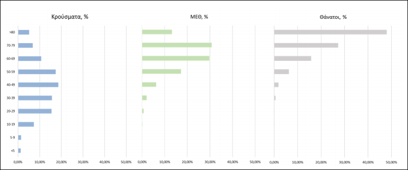 Διάγραμμα 4: Ηλικιακή Κατανομή κρουσμάτων, νοσηλευόμενων στις MEΘ και ασθενών που απεβίωσαν από την αρχή της πανδημίας