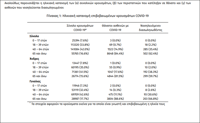 Ο αριθμός των ασθενών που νοσηλεύονται διασωληνωμένοι είναι 805 (62.4% άνδρες). Η διάμεση ηλικία τους είναι 68 έτη. To 85.3% έχει υποκείμενο νόσημα ή/και ηλικία 70 ετών και άνω. Από την αρχή της πανδημίας έχουν εξέλθει από τις ΜΕΘ 2.087 ασθενείς. Οι εισαγωγές νέων ασθενών Covid-19 στα νοσοκομεία της επικράτειας είναι 530 (ημερήσια μεταβολή +44.41%). Ο μέσος όρος εισαγωγών του επταημέρου είναι 461 ασθενείς. Η διάμεση ηλικία των κρουσμάτων είναι 44 έτη (εύρος 0.2 έως 106 έτη), ενώ η διάμεση ηλικία των θανόντων είναι 78 έτη (εύρος 0.2 έως 106 έτη).