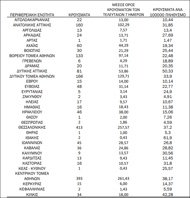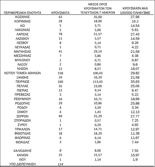Κατανομή ανακοινωθέντων εγχώριων κρουσμάτων: Από το σύνολο των 2.781 νέων κρουσμάτων του νέου ιού στη χώρα 4 είναι εισαγόμενα εκ των οποίων 2 εντοπίστηκαν κατόπιν ελέγχων στις πύλες εισόδου της χώρας. Η κατανομή των 2.777 νέων εγχώριων κρουσμάτων ανά Περιφερειακή Ενότητα παρουσιάζεται στον κατωτέρω πίνακα.