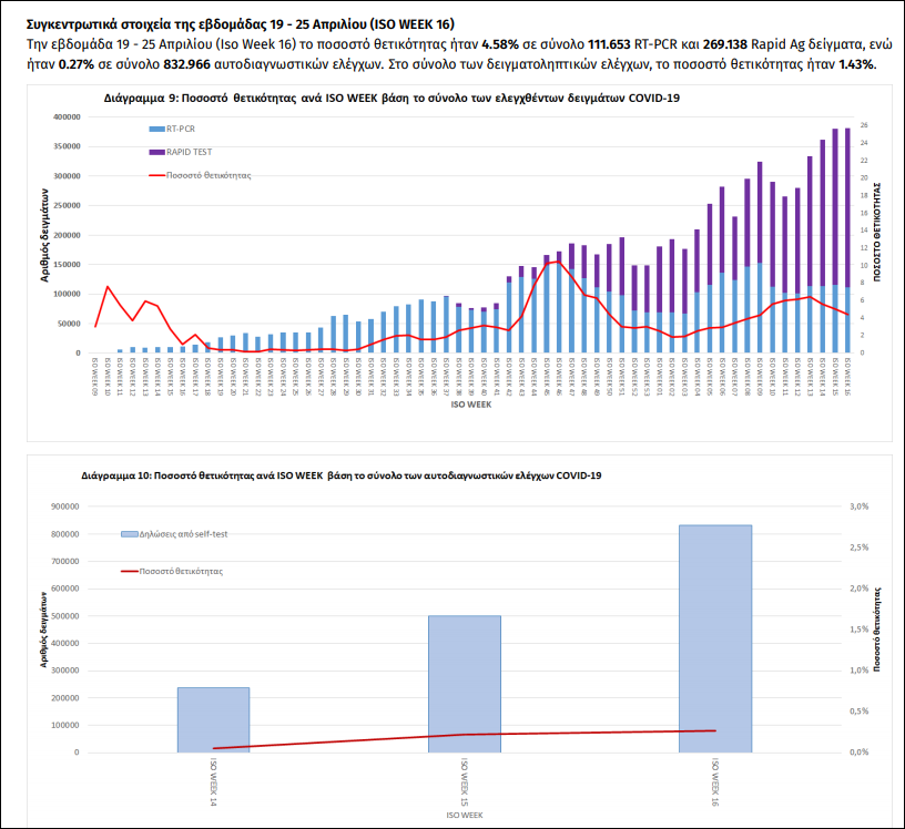 Την εβδομάδα 19 – 25 Απριλίου (Iso Week 16) το ποσοστό θετικότητας ήταν 4.58% σε σύνολο 111.653 RT-PCR και 269.138 Rapid Ag δείγματα, ενώ ήταν 0.27% σε σύνολο 832.966 αυτοδιαγνωστικών ελέγχων. Στο σύνολο των δειγματοληπτικών ελέγχων, το ποσοστό θετικότητας ήταν 1.43%.