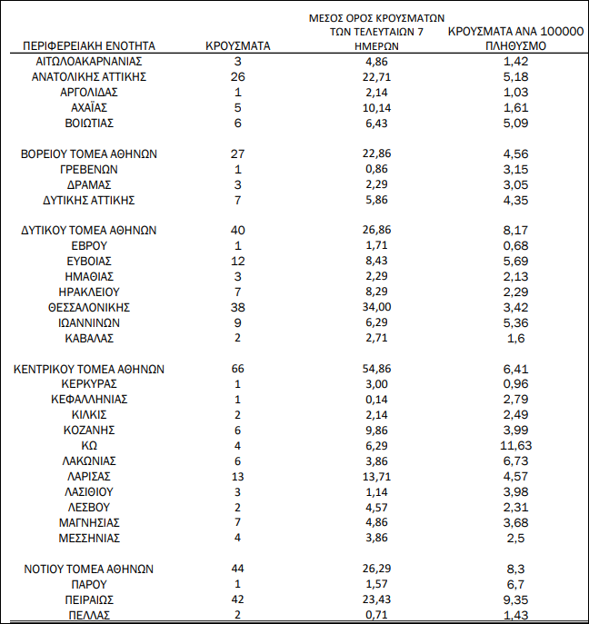 Από τα 469 κρούσματα, τα 252 βρέθηκαν στην Αττική, τα 38 στη Θεσσαλονίκη και σε κάθε περιφέρεια εντοπίστηκαν ως εξής: