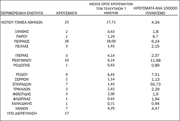 Από τα 489 κρούσματα, τα 252 βρέθηκαν στην Αττική, τα 36 στη Θεσσαλονίκη και σε κάθε περιφέρεια εντοπίστηκαν ως εξής: