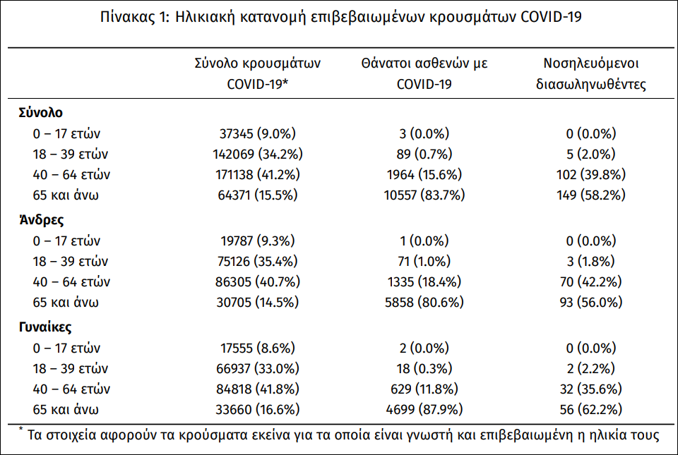 Ακολούθως παρουσιάζεται η ηλικιακή κατανομή των (α) συνολικών κρουσμάτων, (β) των περιστατικών που κατέληξαν σε θάνατο και (γ) των ασθενών που νοσηλεύονται διασωληνωμένοι: