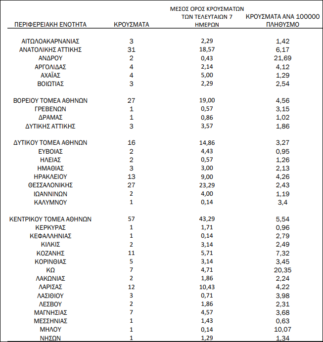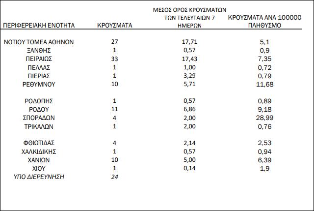 Από τα 395 κρούσματα, τα 195 βρέθηκαν στην Αττική, τα 27 στη Θεσσαλονίκη και σε κάθε περιφέρεια εντοπίστηκαν ως εξής: