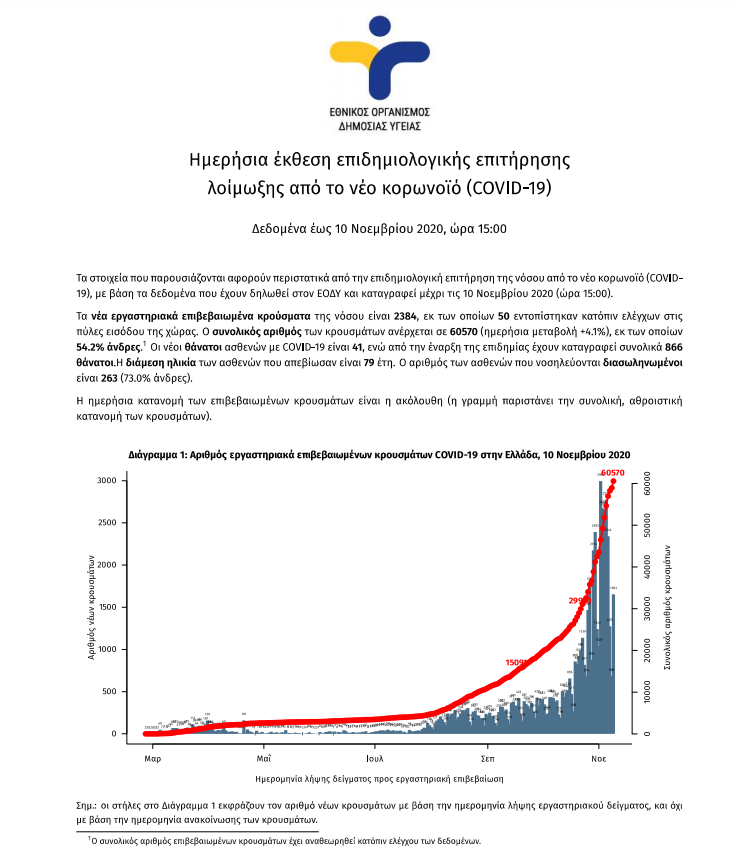 Ημερήσια έκθεση επιδημιολογικής επιτήρησης λοίμωξης από το νέο κορωνοϊό (COVID-19) – Δεδομένα έως 10/11/2020