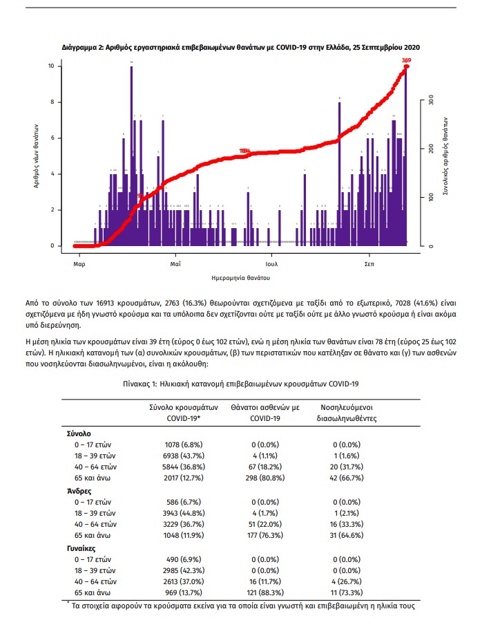 Τέλος, έχουμε 3 ακόμα καταγεγραμμένους θανάτους και 369 θανάτους συνολικά στη χώρα. 138 (37.4%) γυναίκες και οι υπόλοιποι άνδρες. Η διάμεση ηλικία των θανόντων συμπολιτών μας ήταν τα 78 έτη και το 97.0% είχε κάποιο υποκείμενο νόσημα ή/και ηλικία 70 ετών και άνω».