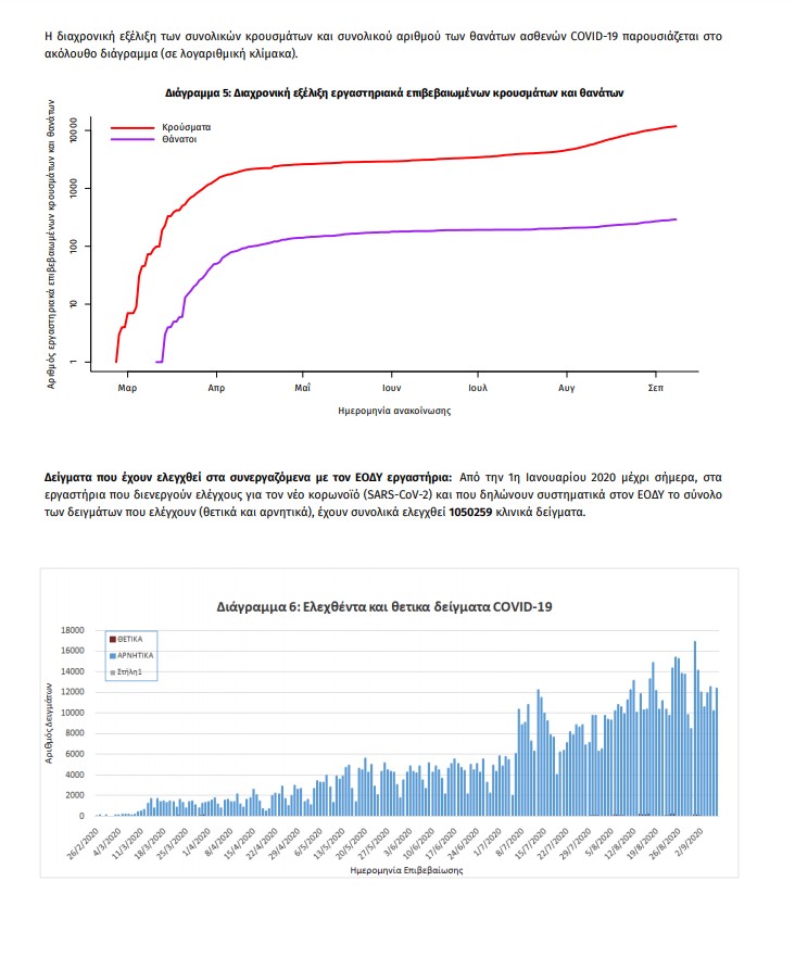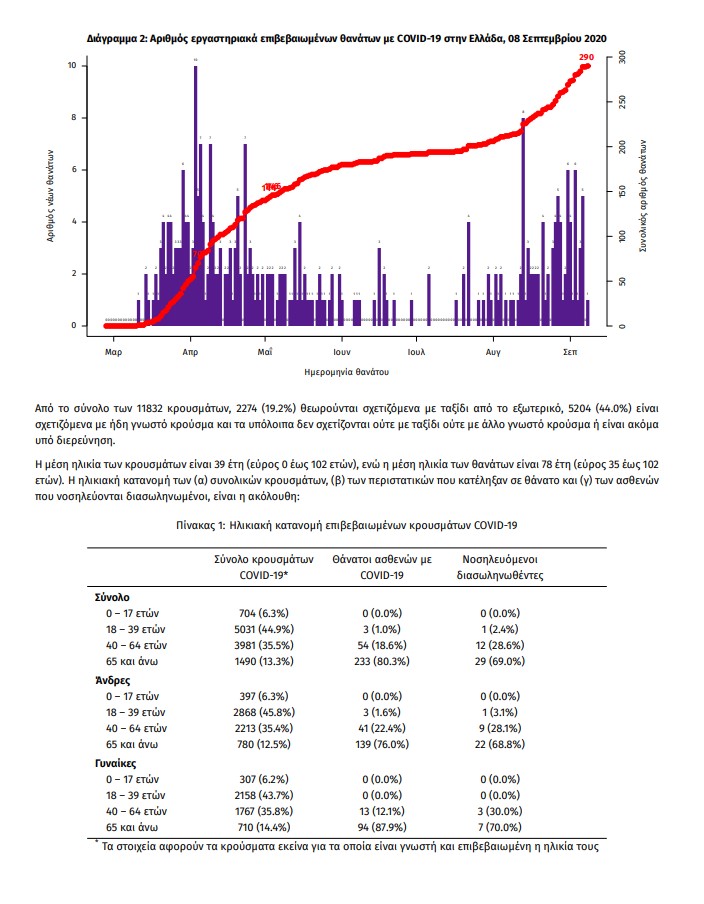 Τέλος, έχουμε 1 ακόμα καταγεγραμμένους θανάτους και 290 θανάτους συνολικά στη χώρα. 107 (36.9%) γυναίκες και οι υπόλοιποι άνδρες. Η διάμεση ηλικία των θανόντων συμπολιτών μας ήταν τα 78 έτη και το 96.2% είχε κάποιο υποκείμενο νόσημα ή/και ηλικία 70 ετών και άνω.»