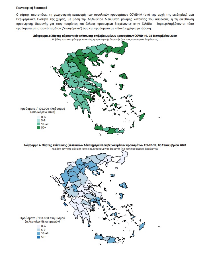 – 65 κρούσματα στην Περιφέρεια Αττικής, εκ των οποίων 5 συνδέονται με συρροές, ενώ 6 αναφέρουν πρόσφατο ταξίδι στο εσωτερικό της χώρας
