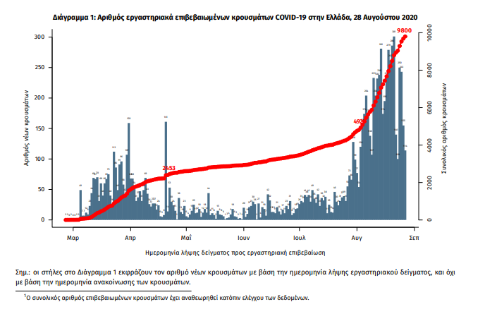 Τα στοιχεία που παρουσιάζονται αφορούν περιστατικά από την επιδημιολογική επιτήρηση της νόσου από το νέο κορωνοϊό (COVID19), με βάση τα δεδομένα που έχουν δηλωθεί στον ΕΟΔΥ και καταγραφεί μέχρι τις 28 Αυγούστου 2020 (ώρα 15:00). Τα νέα εργαστηριακά επιβεβαιωμένα κρούσματα της νόσου είναι 270, εκ των οποίων τα 26 εντοπίστηκαν κατόπιν ελέγχων στις πύλες εισόδου της χώρας. Ο συνολικός αριθμός των κρουσμάτων ανέρχεται σε 9800 (ημερήσια μεταβολή +2.8%), εκ των οποίων 55.6% άνδρες. 1 Οι νέοι θάνατοι ασθενών με COVID-19 είναι 5, ενώ από την έναρξη της επιδημίας έχουν καταγραφεί συνολικά 259 θάνατοι. Η μέση ηλικία των ασθενών που απεβίωσαν είναι 78 έτη. Ο αριθμός των ασθενών που νοσηλεύονται διασωληνωμένοι είναι 35 (65.7% άνδρες). Η ημερήσια κατανομή των επιβεβαιωμένων κρουσμάτων είναι η ακόλουθη (η γραμμή παριστάνει την συνολική, αθροιστική κατανομή των κρουσμάτων).