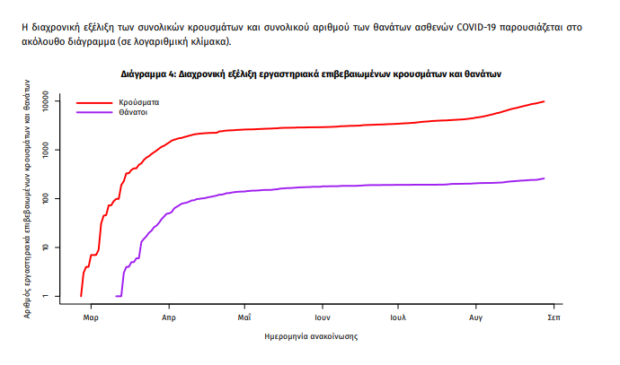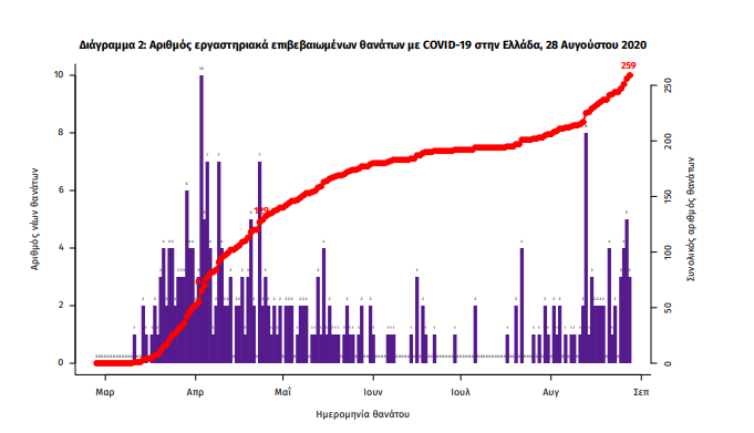 Τα στοιχεία που παρουσιάζονται αφορούν περιστατικά από την επιδημιολογική επιτήρηση της νόσου από το νέο κορωνοϊό (COVID19), με βάση τα δεδομένα που έχουν δηλωθεί στον ΕΟΔΥ και καταγραφεί μέχρι τις 28 Αυγούστου 2020 (ώρα 15:00). Τα νέα εργαστηριακά επιβεβαιωμένα κρούσματα της νόσου είναι 270, εκ των οποίων τα 26 εντοπίστηκαν κατόπιν ελέγχων στις πύλες εισόδου της χώρας. Ο συνολικός αριθμός των κρουσμάτων ανέρχεται σε 9800 (ημερήσια μεταβολή +2.8%), εκ των οποίων 55.6% άνδρες. 1 Οι νέοι θάνατοι ασθενών με COVID-19 είναι 5, ενώ από την έναρξη της επιδημίας έχουν καταγραφεί συνολικά 259 θάνατοι. Η μέση ηλικία των ασθενών που απεβίωσαν είναι 78 έτη. Ο αριθμός των ασθενών που νοσηλεύονται διασωληνωμένοι είναι 35 (65.7% άνδρες). Η ημερήσια κατανομή των επιβεβαιωμένων κρουσμάτων είναι η ακόλουθη (η γραμμή παριστάνει την συνολική, αθροιστική κατανομή των κρουσμάτων).