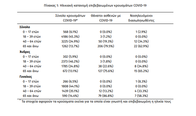 Τέλος, έχουμε 5 ακόμα καταγεγραμμένους θανάτους και 259 θανάτους συνολικά στη χώρα. 91 (35.1%) γυναίκες και οι υπόλοιποι άνδρες. Η διάμεση ηλικία των θανόντων συμπολιτών μας ήταν τα 78 έτη και το 93.8% είχε κάποιο υποκείμενο νόσημα ή/και ηλικία 70 ετών και άνω.