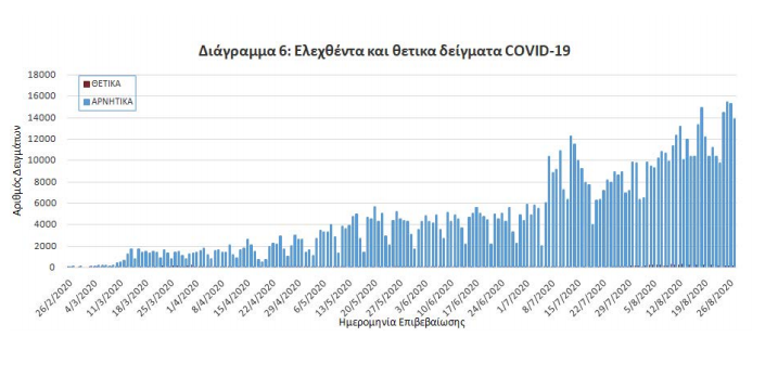 Δείγματα που έχουν ελεγχθεί στα συνεργαζόμενα με τον ΕΟΔΥ εργαστήρια: Από την 1η Ιανουαρίου 2020 μέχρι σήμερα, στα εργαστήρια που διενεργούν ελέγχους για τον νέο κορωνοϊό (SARS-CoV-2) και που δηλώνουν συστηματικά στον ΕΟΔΥ το σύνολο των δειγμάτων που ελέγχουν (θετικά και αρνητικά), έχουν συνολικά ελεγχθεί 917265 κλινικά δείγματα, εκ των οποίων τα 10342(1.12%) ήταν θετικά στον κορωνοϊό (συμπεριλαμβάνονται και περισσότερα από ένα δείγματα ανά άτομο που ελέγχθηκε).