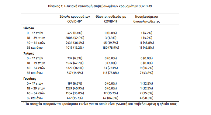 Τέλος, έχουμε 2 ακόμα καταγεγραμμένους θανάτους και 228 θανάτους συνολικά στη χώρα. 79 (34.6%) γυναίκες και οι υπόλοιποι άνδρες. Η διάμεση ηλικία των θανόντων συμπολιτών μας ήταν τα 77 έτη και το 95.6% είχε κάποιο υποκείμενο νόσημα ή/και ηλικία 70 ετών και άνω.