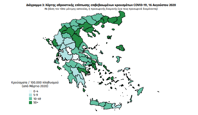 Ο χάρτης αποτυπώνει τη γεωγραφική κατανομή των συνολικών κρουσμάτων COVID-19 (από την αρχή της επιδημίας) ανά Περιφερειακή Ενότητα της χώρας, με βάση την δηλωθείσα διεύθυνση μόνιμης κατοικίας του ασθενούς, ή τη διεύθυνση προσωρινής διαμονής για τους τουρίστες και άλλους προσωρινά διαμένοντες στην Ελλάδα. Συμπεριλαμβάνονται τόσο κρούσματα με ιστορικό ταξιδίου (“εισαγόμενα”) όσο και κρούσματα με πιθανή εγχώρια μετάδοση.