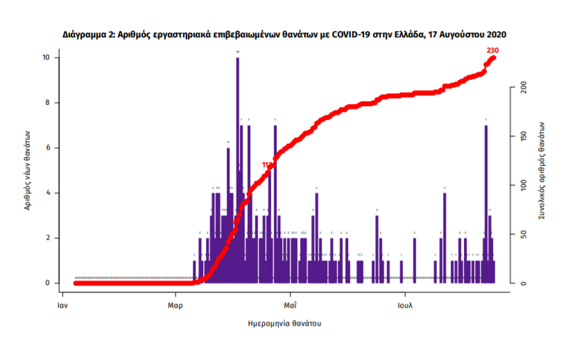 Τα νέα εργαστηριακά επιβεβαιωμένα κρούσματα της νόσου είναι 150, εκ των οποίων τα 17 εντοπίστηκαν κατόπιν ελέγχων στις πύλες εισόδου της χώρας. Ο συνολικός αριθμός των κρουσμάτων ανέρχεται σε 7222 (ημερήσια μεταβολή +2.1%), εκ των οποίων 55.2% άνδρες. 1 Οι νέοι θάνατοι ασθενών με COVID-19 είναι 2, ενώ από την έναρξη της επιδημίας έχουν καταγραφεί συνολικά 230 θάνατοι. Η μέση ηλικία των ασθενών που απεβίωσαν είναι 77 έτη. Ο αριθμός των ασθενών που νοσηλεύονται διασωληνωμένοι είναι 23 (69.6% άνδρες).