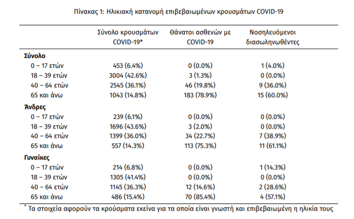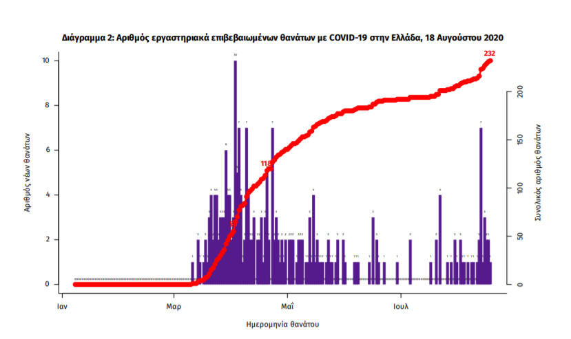 Τέλος, έχουμε 2 ακόμα καταγεγραμμένους θανάτους και 232 θανάτους συνολικά στη χώρα. 82 (35.3%) γυναίκες και οι υπόλοιποι άνδρες. Η διάμεση ηλικία των θανόντων συμπολιτών μας ήταν τα 77 έτη και το 95.3% είχε κάποιο υποκείμενο νόσημα ή/και ηλικία 70 ετών και άνω.