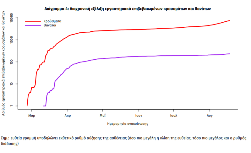 Η διαχρονική εξέλιξη των συνολικών κρουσμάτων και συνολικού αριθμού των θανάτων ασθενών COVID-19 παρουσιάζεται στο ακόλουθο διάγραμμα (σε λογαριθμική κλίμακα).