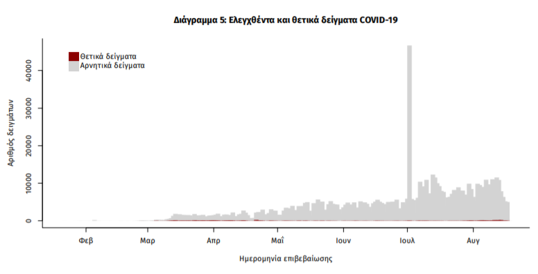 Δείγματα που έχουν ελεγχθεί στα συνεργαζόμενα με τον ΕΟΔΥ εργαστήρια: Από την 1η Ιανουαρίου 2020 μέχρι σήμερα, στα εργαστήρια που διενεργούν ελέγχους για τον νέο κορωνοϊό (SARS-CoV-2) και που δηλώνουν συστηματικά στον ΕΟΔΥ το σύνολο των δειγμάτων που ελέγχουν (θετικά και αρνητικά), έχουν συνολικά ελεγχθεί 740871 κλινικά δείγματα, εκ των οποίων τα 8361 (1.1%) ήταν θετικά στον κορωνοϊό (συμπεριλαμβάνονται και περισσότερα από ένα δείγματα ανά άτομο που ελέγχθηκε).