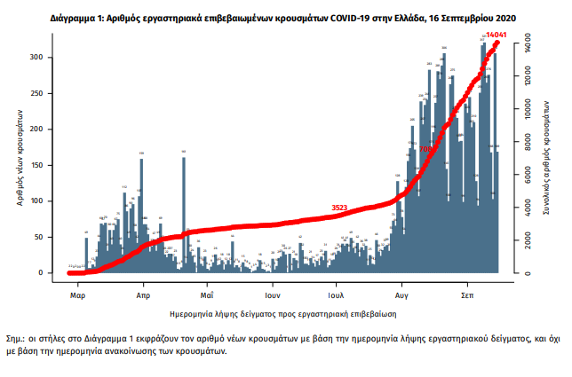 Τα στοιχεία που παρουσιάζονται αφορούν περιστατικά από την επιδημιολογική επιτήρηση της νόσου από το νέο κορωνοϊό (COVID19), με βάση τα δεδομένα που έχουν δηλωθεί στον ΕΟΔΥ και καταγραφεί μέχρι τις 16 Σεπτεμβρίου 2020 (ώρα 15:00). Τα νέα εργαστηριακά επιβεβαιωμένα κρούσματα της νόσου είναι 312, εκ των οποίων 27 συνδέονται με γνωστές συρροές και 22 εντοπίστηκαν κατόπιν ελέγχων στις πύλες εισόδου της χώρας. Ο συνολικός αριθμός των κρουσμάτων ανέρχεται σε 14041 (ημερήσια μεταβολή +2.3%), εκ των οποίων 55.5% άνδρες.