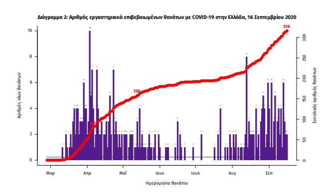 Τέλος, έχουμε 3 ακόμα καταγεγραμμένους θανάτους και 316 θανάτους συνολικά στη χώρα. 118 (37.3%) γυναίκες και οι υπόλοιποι άνδρες. Η διάμεση ηλικία των θανόντων συμπολιτών μας ήταν τα 78 έτη και το 96.5% είχε κάποιο υποκείμενο νόσημα ή/και ηλικία 70 ετών και άνω.