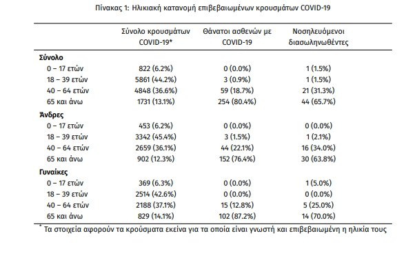 Η μέση ηλικία των κρουσμάτων είναι 39 έτη (εύρος 0 έως 102 ετών), ενώ η μέση ηλικία των θανάτων είναι 78 έτη (εύρος 35 έως 102 ετών). Η ηλικιακή κατανομή των (α) συνολικών κρουσμάτων, (β) των περιστατικών που κατέληξαν σε θάνατο και (γ) των ασθενών που νοσηλεύονται διασωληνωμένοι, είναι η ακόλουθη: