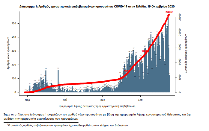 Τα στοιχεία που παρουσιάζονται αφορούν περιστατικά από την επιδημιολογική επιτήρηση της νόσου από το νέο κορωνοϊό (COVID19), με βάση τα δεδομένα που έχουν δηλωθεί στον ΕΟΔΥ και καταγραφεί μέχρι τις 19 Οκτωβρίου 2020 (ώρα 15:00). Τα νέα εργαστηριακά επιβεβαιωμένα κρούσματα της νόσου είναι 438, εκ των οποίων 62 συνδέονται με γνωστές συρροές και 42 εντοπίστηκαν κατόπιν ελέγχων στις πύλες εισόδου της χώρας. Ο συνολικός αριθμός των κρουσμάτων ανέρχεται σε 25802 (ημερήσια μεταβολή +1.7%), εκ των οποίων 55.6% άνδρες. 1 Οι νέοι θάνατοι ασθενών με COVID-19 είναι 11, ενώ από την έναρξη της επιδημίας έχουν καταγραφεί συνολικά 520 θάνατοι.Η διάμεση ηλικία των ασθενών που απεβίωσαν είναι 79 έτη. Ο αριθμός των ασθενών που νοσηλεύονται διασωληνωμένοι είναι 85 (69.4% άνδρες). Η ημερήσια κατανομή των επιβεβαιωμένων κρουσμάτων είναι η ακόλουθη (η γραμμή παριστάνει την συνολική, αθροιστική κατανομή των κρουσμάτων).