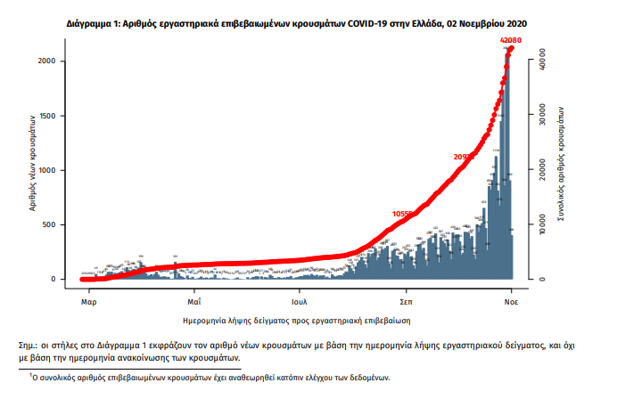 Τα στοιχεία που παρουσιάζονται αφορούν περιστατικά από την επιδημιολογική επιτήρηση της νόσου από το νέο κορωνοϊό (COVID19), με βάση τα δεδομένα που έχουν δηλωθεί στον ΕΟΔΥ και καταγραφεί μέχρι τις 02 Νοεμβρίου 2020 (ώρα 15:00). Τα νέα εργαστηριακά επιβεβαιωμένα κρούσματα της νόσου είναι 1152, εκ των οποίων 96 συνδέονται με συρροές και 33 εντοπίστηκαν κατόπιν ελέγχων στις πύλες εισόδου της χώρας. Ο συνολικός αριθμός των κρουσμάτων ανέρχεται σε 42080 (ημερήσια μεταβολή +2.8%), εκ των οποίων 54.9% άνδρες. 1 Οι νέοι θάνατοι ασθενών με COVID-19 είναι 7, ενώ από την έναρξη της επιδημίας έχουν καταγραφεί συνολικά 642 θάνατοι.Η διάμεση ηλικία των ασθενών που απεβίωσαν είναι 79 έτη. Ο αριθμός των ασθενών που νοσηλεύονται διασωληνωμένοι είναι 153 (76.2% άνδρες). Η ημερήσια κατανομή των επιβεβαιωμένων κρουσμάτων είναι η ακόλουθη (η γραμμή παριστάνει την συνολική, αθροιστική κατανομή των κρουσμάτων).