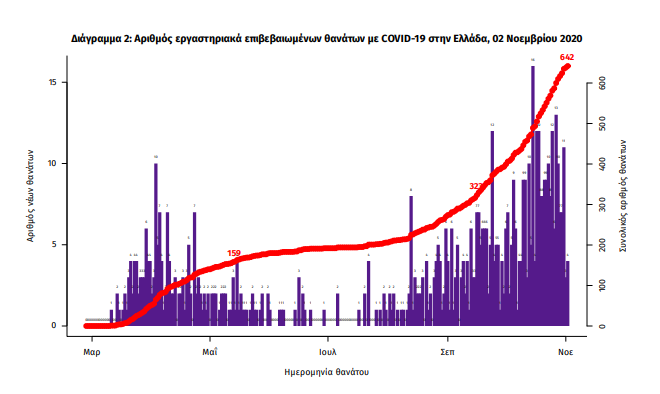 Τα στοιχεία που παρουσιάζονται αφορούν περιστατικά από την επιδημιολογική επιτήρηση της νόσου από το νέο κορωνοϊό (COVID19), με βάση τα δεδομένα που έχουν δηλωθεί στον ΕΟΔΥ και καταγραφεί μέχρι τις 02 Νοεμβρίου 2020 (ώρα 15:00). Τα νέα εργαστηριακά επιβεβαιωμένα κρούσματα της νόσου είναι 1152, εκ των οποίων 96 συνδέονται με συρροές και 33 εντοπίστηκαν κατόπιν ελέγχων στις πύλες εισόδου της χώρας. Ο συνολικός αριθμός των κρουσμάτων ανέρχεται σε 42080 (ημερήσια μεταβολή +2.8%), εκ των οποίων 54.9% άνδρες. 1 Οι νέοι θάνατοι ασθενών με COVID-19 είναι 7, ενώ από την έναρξη της επιδημίας έχουν καταγραφεί συνολικά 642 θάνατοι.Η διάμεση ηλικία των ασθενών που απεβίωσαν είναι 79 έτη. Ο αριθμός των ασθενών που νοσηλεύονται διασωληνωμένοι είναι 153 (76.2% άνδρες). Η ημερήσια κατανομή των επιβεβαιωμένων κρουσμάτων είναι η ακόλουθη (η γραμμή παριστάνει την συνολική, αθροιστική κατανομή των κρουσμάτων).